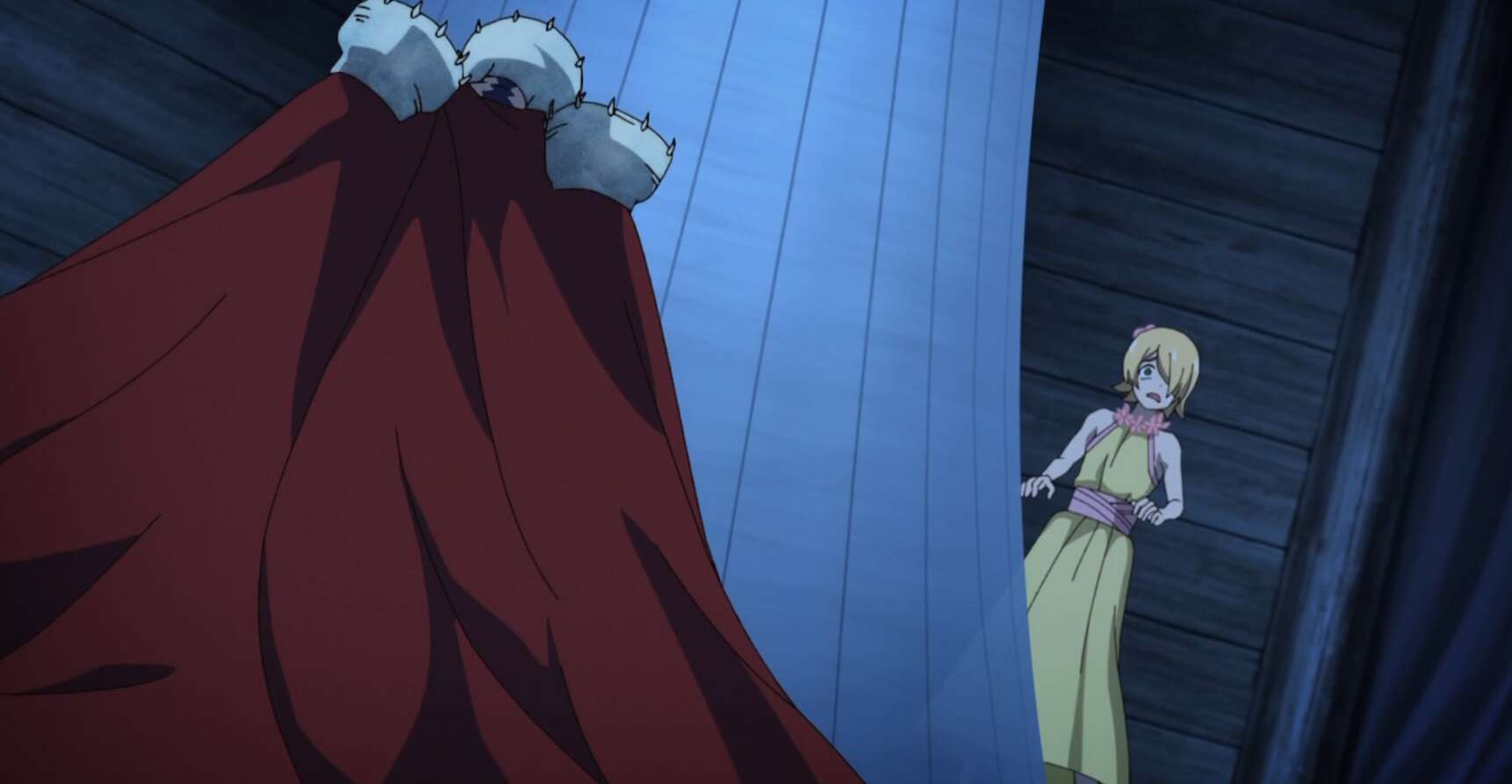 一方、後宮に潜入中のコハク達の内、銀狼が頭首に呼ばれて頭首の部屋まで一人聞くことになります。一人で行きたくない、と駄々をこねる銀狼ですが、コハクに言われて嫌々頭首のもとへと向かいます。銀狼は頭首と二人で会う前に、イバラの身体検査を受けさせられることになります。