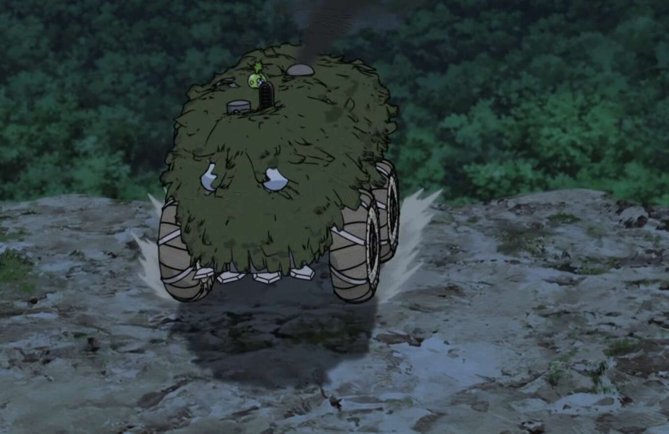 脱出させたラボカーに千空達は乗り込み、スイカと銀狼は千空達と合流します。しかし、脱出したラボカーはすぐに敵に取り囲まれてしまいます。しかしながら、島の人は自動車を知らないので、ラボカーを生き物と思い込み取り囲んだままラボカーに近付こうとしません。