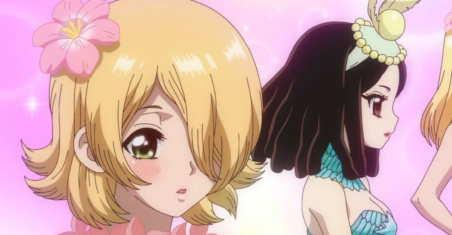シャンプーとコンディショナーでコハクの髪を整えて、さらにラメ、ファンデーション、香水、口紅でコハクを可愛く変身させます。試行錯誤しながらアマリリスのアドバイスもあり、コハクは可愛く変身します。