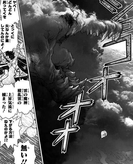 麻布で作った気球を手に入れた千空達は、気球で石神村まで帰ろうとします。気球なら二時間の旅ですが、途中鳥の衝突の事故で気球に穴が開いてしまい、さらに積乱雲に遭遇してしまいます。何とか高度を下げようとしますが、積乱雲の上昇気流に捕まってしまいどんどん高度が上がり、このままでは千空達は墜落してしまいます。