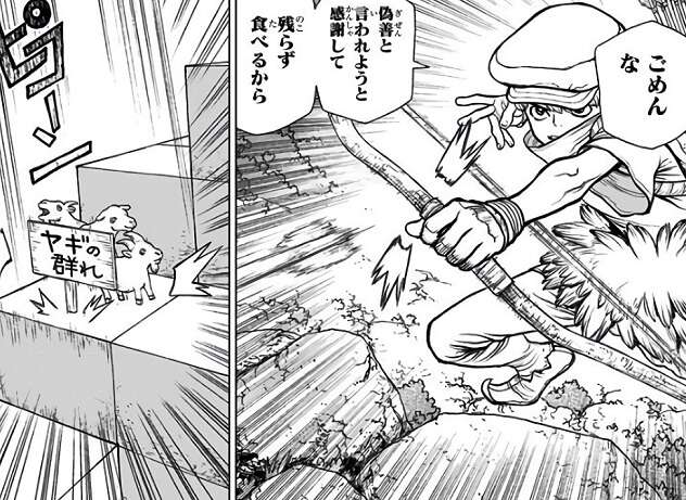 無事、気球で石神村に帰還した千空達は村で豪華なご馳走の歓迎を受けますが、ご馳走は魚料理ばかりでした。魚料理ばかりの食事を見た龍水は落胆し、他の食料も気球から絶対に見つけると意気込みます。その後気球で空からワールドマップを作成し、ヤギなどの食料だけでなく杉などの建築材も順調に見つけていきます。