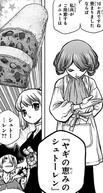 黒焦げの固いパンしか作れなかった千空と龍水は、理想のパンがどうしても欲しいと、プロのシェフを石化から復活させようとします。龍水は女記者の南が、石化復活液を隠し持っていると推測し、南と取引をして龍水の執事のフランソワを復活させます。フランソワはシェフとしての腕も確かで、現代の有名パン屋と比べても遜色のない『ヤギの恵みのシュトーレン』を作り、保存食問題をクリアします。