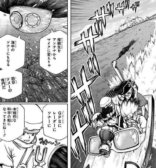 謎の電波はモールス信号で「WHY」と繰り返し打ってくることから、「ホワイマン」と名付け、対抗策を皆で考えます。そして、千空達はレーダーを作成し見えない敵に対して、対抗しようとします。さらにレーダーの接続先をアンテナからマイクに変えることで、海中ソナーとしても利用できます。そして海中ソナーを、魚群探知機として使用することで魚を大量に入手することが可能となり、船の食糧問題もクリア出来ました。