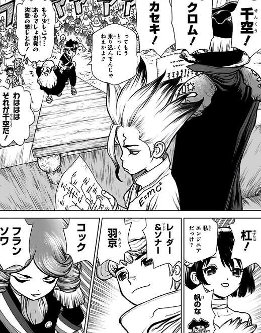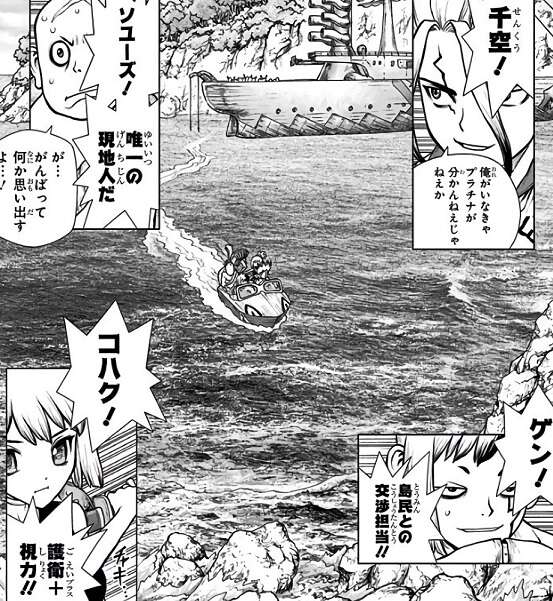 自分の本当の名前を「ソユーズ」と名乗る村人が現れ、千空は宝島には人間がいると推測します。その「ソユーズ」と名乗る村人は石神村の遠縁の人間で、日本を目指さず宝島に残った住民ではないかとさらに推測します。さらに宝島に残った住民がホワイマンの可能性もあり、千空達は偶然訪れた嵐に紛れて宝島に接近することにします。