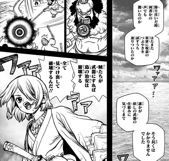 サクラメント川でコーンを見つけた千空は、上流にコーンが生えている事を確信します。川の上流の探索を続けるとコーンが続々流れてきますが、千空は都合よく川にコーンが流れている事に違和感を覚えます。夜になりヨーロッパアワノメイガを見つけた千空は、この蛾の習性からすぐ近くに大量のコーンがあると確信しますが、それとほぼ同時に千空達はいきなり何者かにマシンガンで船を攻撃されます。