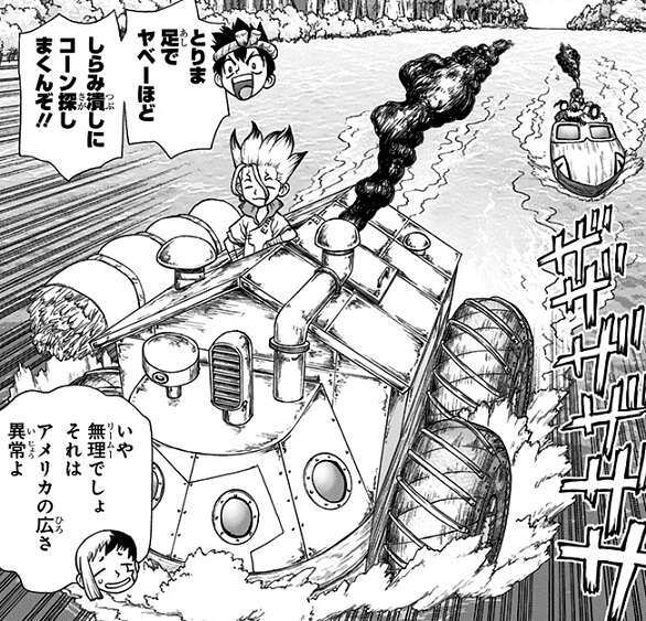 宇宙船を作る為の素材を世界中から集める為、まずはアメリカ大陸にコーンを求めて船で航海を始めます。太平洋を横断してアメリカ大陸に向かいますが、アメリカ大陸までのルートを巡って千空と龍水の意見が対立します。等角航路を使って70日をかけて進むルートを主張する龍水と、大圏航路を使って40日で進むルートを主張する千空は、お互い一歩も主張を曲げず決闘を行う事になります。