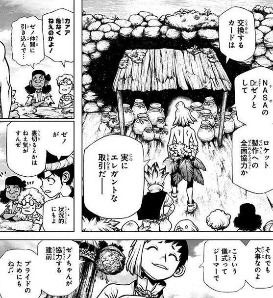 石化装置によって石化した後、再び復活すれば死者をも蘇らせれると分かり、千空と司はあらためて月まで行ってホワイマンに会う決心をします。まずは月まで行くロケットエンジンを作るため、ゼノを復活させて協力するように千空は取引を持ちかけます。