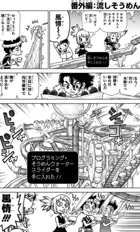 千空達は流しそうめんをして楽しみますが、下流の人まで麺が流れてこない悩みがあります。そこでSAIにプログラミング・そうめんウォータースライダーを考えてもらいますが、全員に均等確率で麺が流れ込むように考えてもらった結果、風情も何もない流しそうめんになってしまいました。