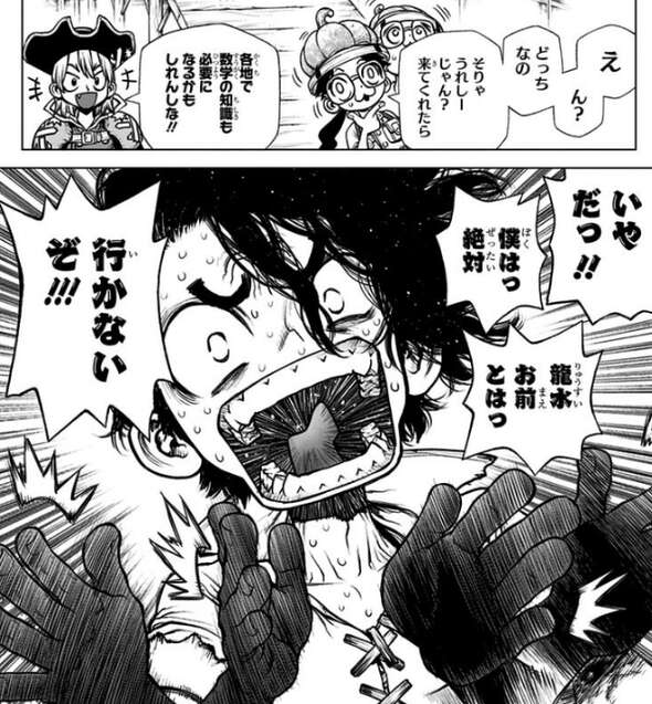 コンピューターを作る回路図をインドからコーンシティにFAXで送ることにし、コンピューター実制作はコーンシティ組に託すことにします。千空達は次の街作りのためにインドを出港する準備を始め、龍水はSAIを次の街作りの旅に一緒に連れて行こうとします。しかし、龍水を疎ましく思うSAIは街作りの旅に行くことを拒否しインドに残ると主張します。