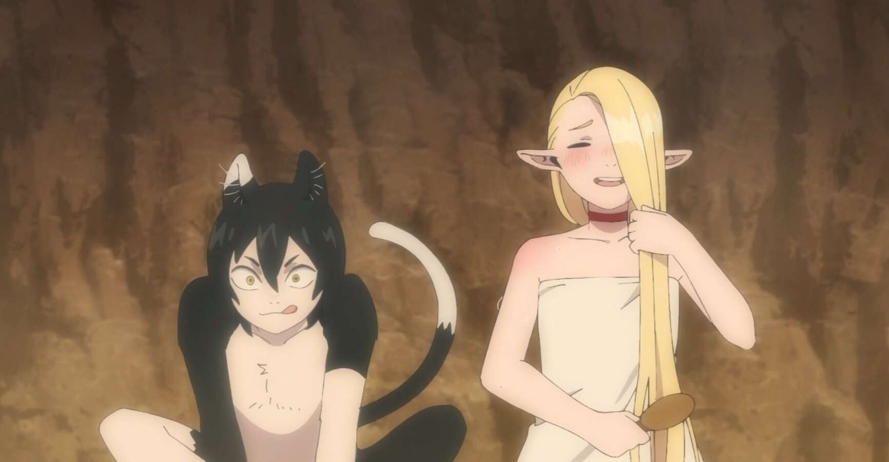 アイスゴーレムに襲われてすっかり体が冷えてしまい、マルシルは強い熱を出す魔法陣を描いて皆で暖を取ることにします。全員が濡れた服を脱ぐことにしますが、イヅツミは周りの目を気にせず服を脱ごうとします。マルシルは布でイヅツミが見えないよう遮ろうとしますが、イヅツミは、獣が裸になった所で喜ぶ奴なんていない、と言うと構わず脱ぎます。魔物大好きなライオスはイヅツミの裸(乳首の数とか尻尾の付け根など)に興味を示しますが、さすがにまずいと思ったマルシルがイヅツミを布でくるみ、ライオスから見えないようにします。