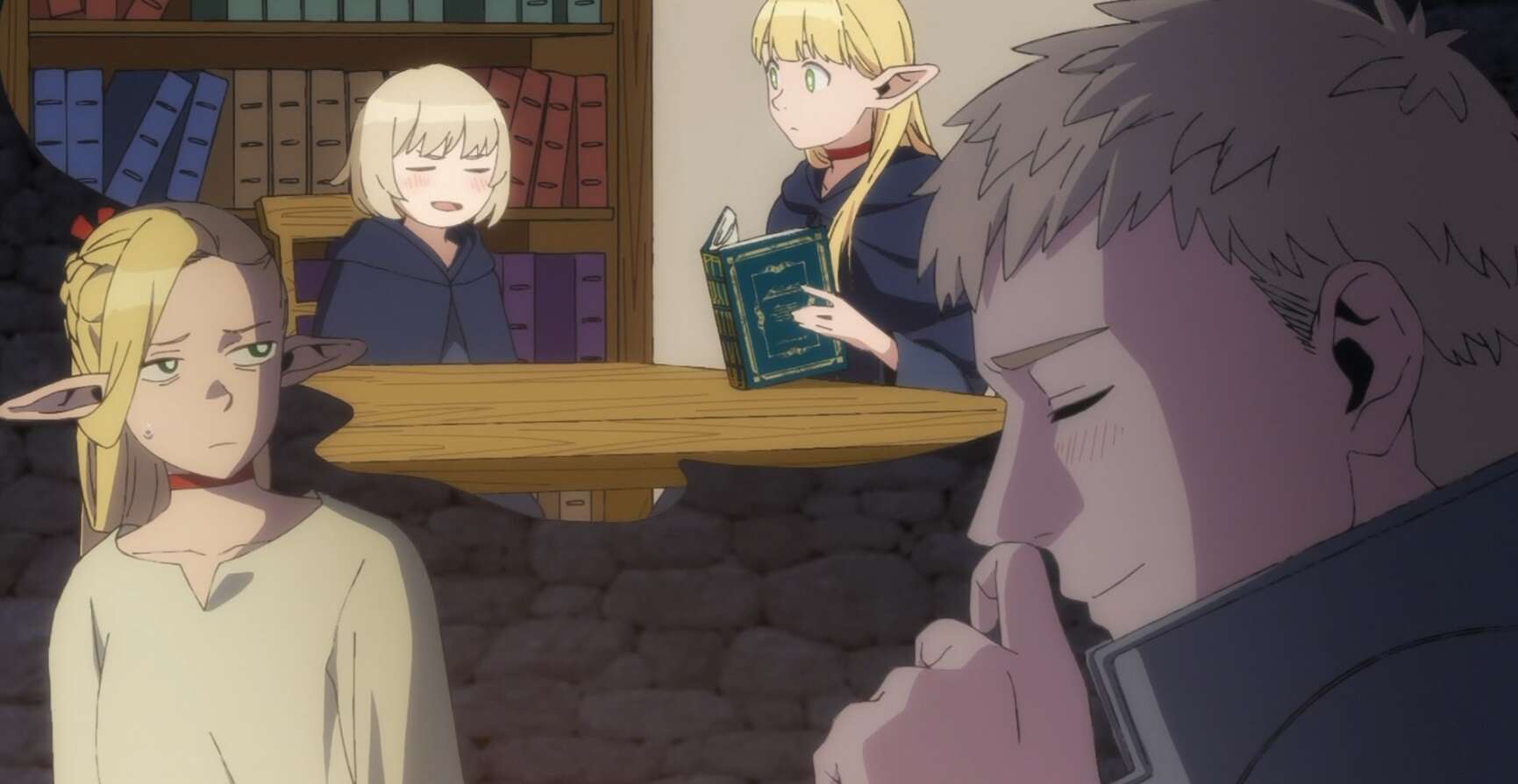場面は現代に戻りライオスはファリンからの手紙で、マルシルの事をすごい人だといつも褒めていたと明かします。マルシルも、ファリンが魔術学校でライオスは犬のモノマネがすごいと言っていた事を思い出しますが、犬のモノマネのくだりは伏せて、ライオスの事を尊敬していると言ってたとライオスに教えてあげます。