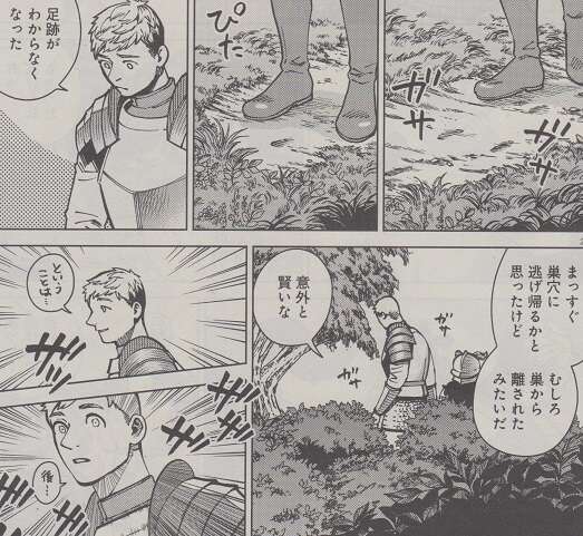 すると普通の兎が見つかります。爪も牙も翼もない、迷宮の兎とは無関係そうな兎ですが、ライオスは慎重に追い立てていきます。ライオス達が出す音を聞いて、兎は逃げ出しますがライオスは足跡をたどって追いかけます。