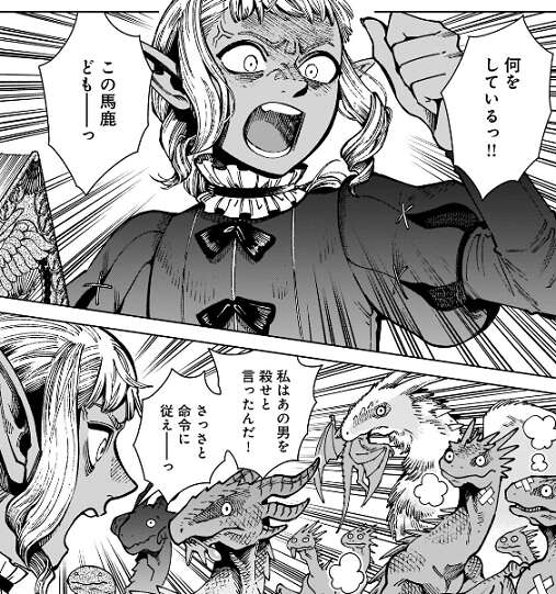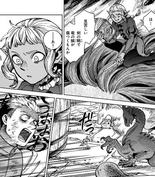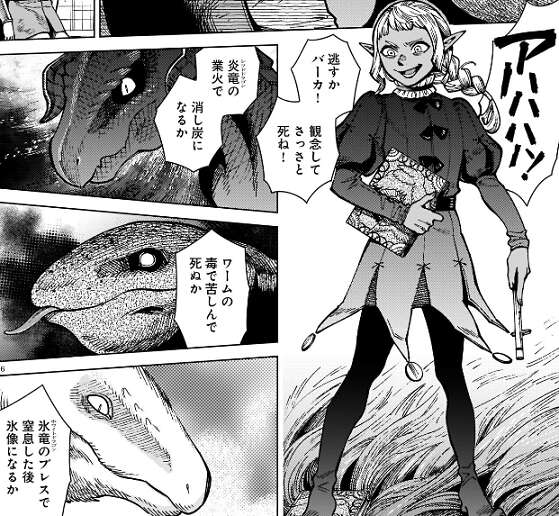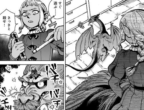 竜達は好き勝手にしていて、グリーンドラゴンは純銀のスプーンで遊び始める始末です。そんな竜達を見て、シスルは竜達を怒ります。そしてライオスを殺すように命令し、再びライオスを襲わせます。