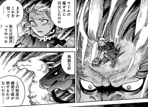 そして、今度こそ塵にしてやる、とシスルは言うとレッドドラゴンとホワイトドラゴンに今すぐ“それ”を吹き飛ばすように命令します。するとワームの毒ガスに引火したようで、大爆発を起こします。