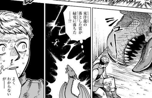 それを見てイラっときたシスルは、東洋龍を使ってライオスを殺そうとします。東洋龍は雷を使いますが、その雷はグリーンドラゴンがくわえていたスプーンに落ちて、結果的にライオスは助かります。