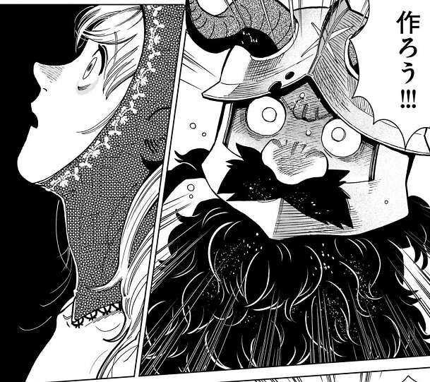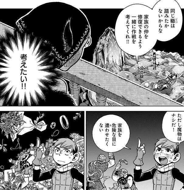 マルシルは元々は数百年かけて十年、寿命を延ばせたら上出来だと考えていたようで、こんな地上の全てを巻き込んで全ての種族の寿命を同じにするつもりではなかった事を思い出したようです。そして今回の旅の最初の方のセンシの決め台詞で、初心を思い出したのか、もしくは吹っ切れるきっかけになったのか、マルシルは号泣して仲間の所に戻ってきました。しかし1巻のセンシの決め台詞を言っていた頃にイヅツミはまだいないので、なぜ三人がそこまで食生活、生活リズム、適切な運動について熱弁しているのか理解できないようで、かなりドン引きしています。