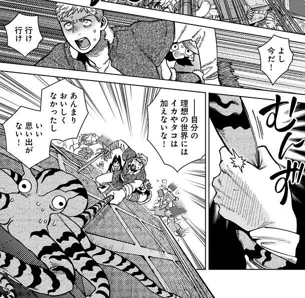 ライオスはドッペルゲンガーを引きはがし、ドッペルゲンガーを思いっきり振り回し、落ちてきた巨大な本に叩きつけます。するとドッペルゲンガーは正体を現し、タコの姿に戻ります。そのタコに捕まってライオス達はマルシルがいる所まで登っていこうとします。登りながら、イカにいい思い出がないライオスは、自分の理想の世界にはイカやタコは加えない、とマルシルに言います。しかし、マルシルは3巻の第16話でイカやタコはすごくおいしいと言っていたので、自分の理想の世界にイカやタコを加えないのは嫌だろう、とライオスはマルシルに言います。