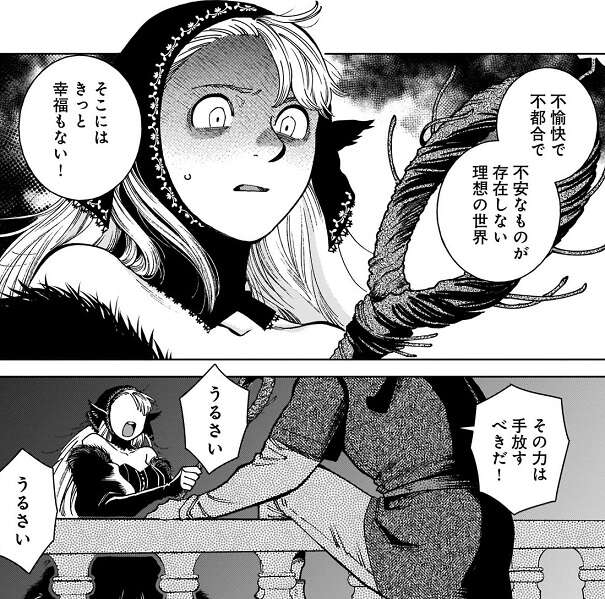 そして、マルシルが本当はその力の歪さを分かっていて、不愉快で不都合で不安なものが存在しない理想の世界、そこにはきっと幸福もない!と、ライオスは言います。ライオスはその力を手放すようにマルシルを説得しますが、うるさい、とマルシルはライオスに何度も叫びます。