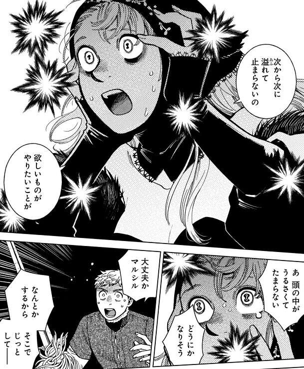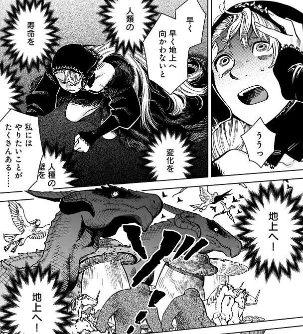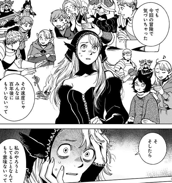 しかし、マルシルは今回の冒険でその速度で調べてたら、百年後にはみんなはもういないと気付いた、とライオスに話します。そして、私のやろうとしている事なんてもう意味なって、とマルシルは言い、ずっと皆と一緒にいたいから、その為に死を遠ざけたいと願う事はそんなにいけないことなの?と、ライオスに問いかけます。