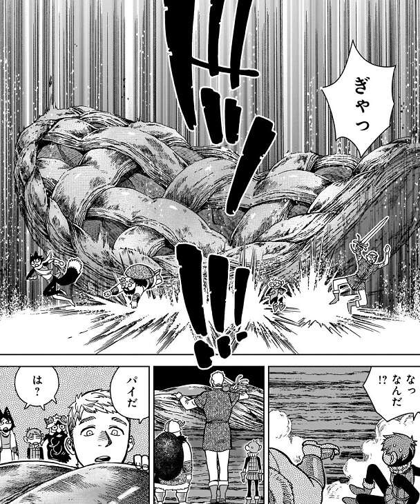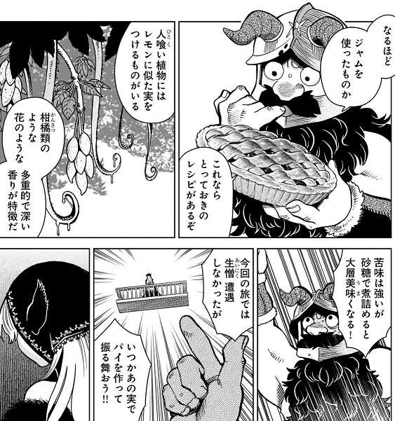 落ちてきたのはジャムを使ったパイで、そのパイを味見したセンシは、人喰い植物にレモンに似た実をつけるものがいる、その実でパイを作って振舞おうとセンシがマルシルに叫ぶと、レモンの匂いがするパイがたくさん落ちてきます。さらにライオスはレッドドラゴンの肉を使ったミートパイはどうだ、と言うと、今度はミートパイが落ちてきます。