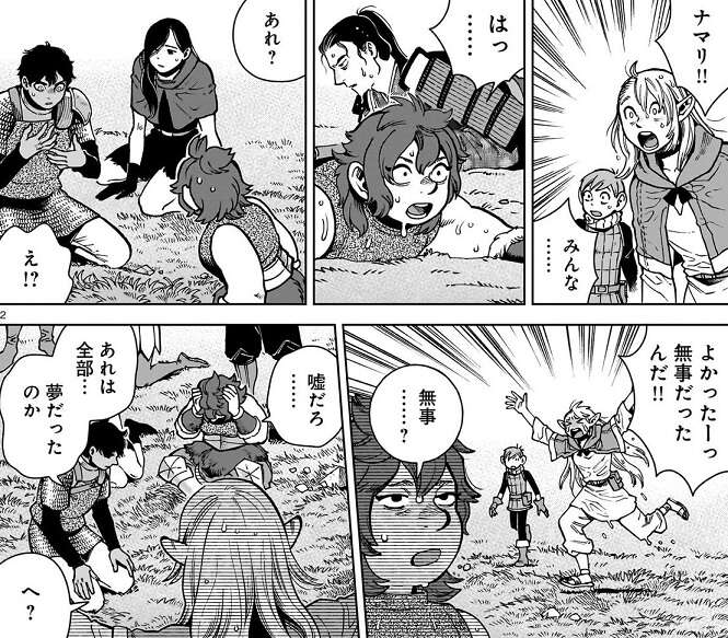 改めてライオスに、とにかく無事でよかった、と声を掛けるマルシル、さらに胸を張ってみんなにも元気な顔を見せてあげて、と言います。気が進まない感じで返事をするライオスですが、そこにナマリ達が走り寄ってきます。ナマリ達も怒ってはいたようですが、ライオスが近付くとナマリ達からもライオスは無事を祝ってもらえました。
