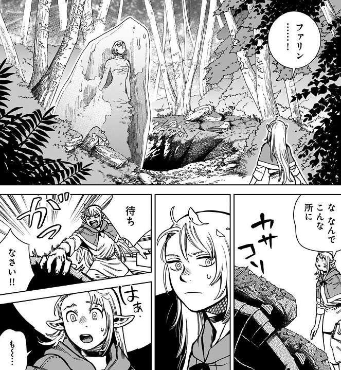 さらにマルシルが魔物のライオスの断片をたどって、森の方へと進んでみると氷漬けのファリンを見つけます。その近くに人影を見つけ、マルシルが人影を掴むと人に戻ったライオスがいました。