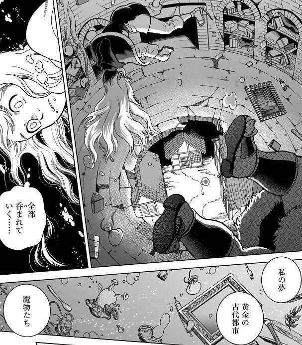 迷宮の入り口から水と一緒に吐き出されたマルシル達ですが、一応無事のようです。さらにヤアドやシスルも塵にならず無事でした。どうやら、翼獅子が迷宮から地上に出た時に、地上との境目が消えて、翼獅子が去っても迷宮の力の影響はすぐに失われるわけではないようです。しかし、この先ヤアド達がどうなるかは分からず、徐々に塵になっていくとか……?と、マルシルは予想します。