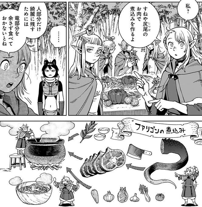 続いてイヅツミはマルシルに話を聞きに行きます。マルシルはファリンの竜部分のすねや尻尾のお肉で煮込み料理を作っている最中でした。