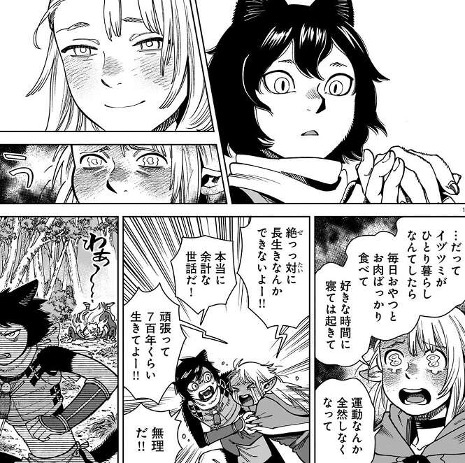 マルシルはイヅツミに好き嫌いし過ぎたら長生きできない、と野菜も時々食べてと言いますが、途中から泣き出してしまいます。イヅツミが好き勝手にひとり暮らししたら、毎日おやつとお肉ばっかり食べて、好きな時間に寝ては起きて、運動もしない、と絶対に長生きできない、二度と会えなくなる、とマルシルは号泣します。イヅツミは、本当に余計なお世話だ、と嫌がりますが、頑張って7百年くらい生きてとマルシルは無茶なお願いをします。