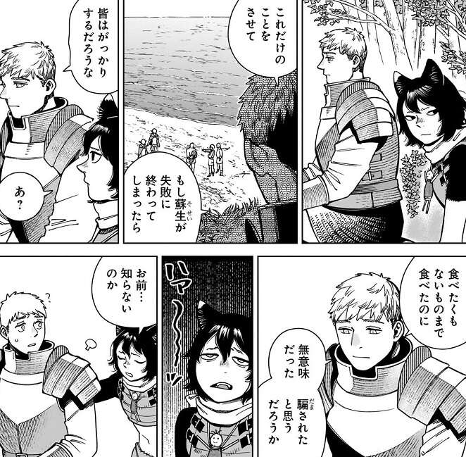 マルシルはパッタドルと今後の事を話していて、マルシルが古代魔術を使用した事実は消えないので、カナリア隊と一緒に行き、しばらくはカナリア隊?西方エルフの国?の管理下で生活をすることになるようです。マルシルは合意の上でやったことだし、やらなければもっと後悔していた、と納得しているようですが、期限次第ではみんなと長い間会えなくなることが寂しいようです。しかし、マルシル達の功績を考えれば酌量の余地はありそうです、手紙のやり取りくらいなら出来るかもしれない、とマルシルはパッタドルから励まされます。