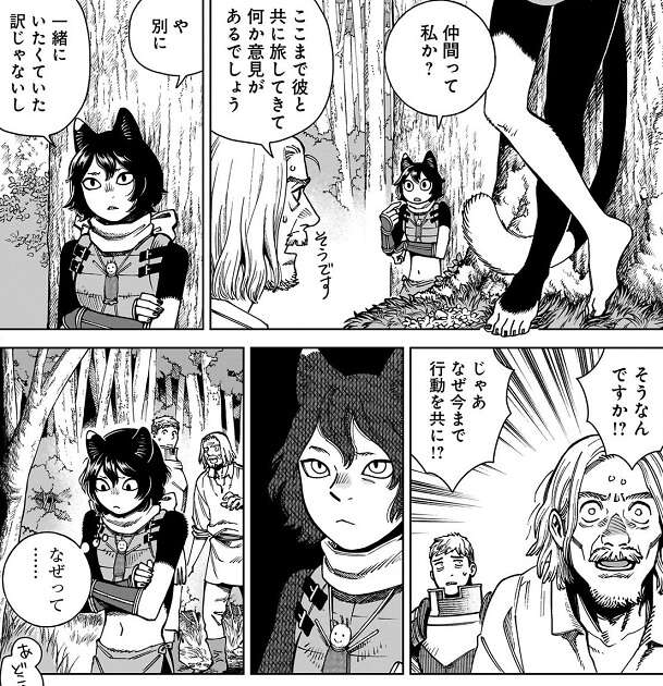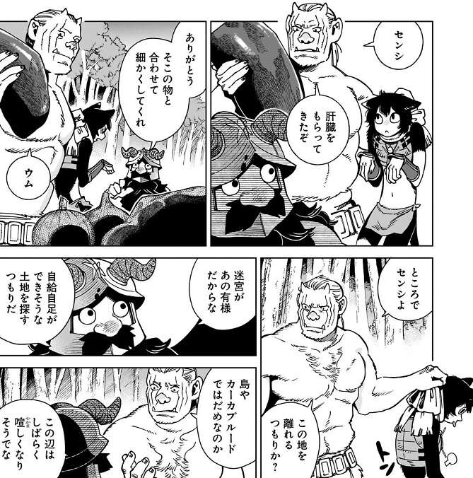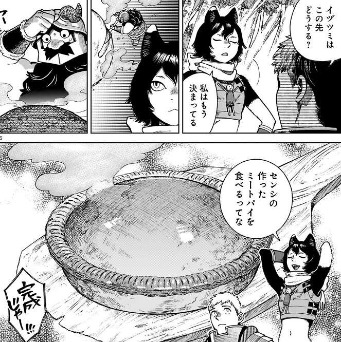 そもそもライオスが翼獅子を食うから皆が苦労する羽目になった、とイヅツミが言うと、ライオスは、責任取らないとな、と答えます。そして、ライオスがイヅツミにこの先どうするか聞くと、イヅツミは迷わずセンシの作ったミートパイを食べる、と答えます。