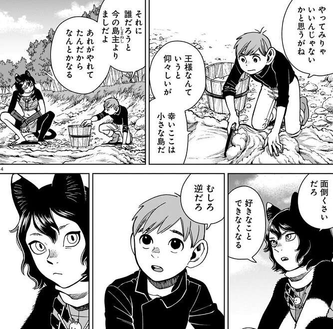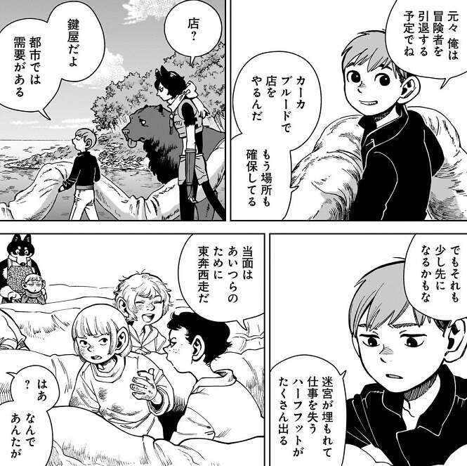 チルチャックとイヅツミの会話はライオスに移り、チルチャックはライオスに島の王をやってみればいい、と言います。ライオスが冒険者を止めても他に出来る事もないし、ここでなら研究者を招いて迷宮や魔物の研究をさせることも出来るかもしれない、とチルチャックは言います。イヅツミは王になったら面倒くさくて、好きなことも出来ない、と言いますが、チルチェックは、全部が全部好きなようにいかないさ、とチルチャックに答えます。