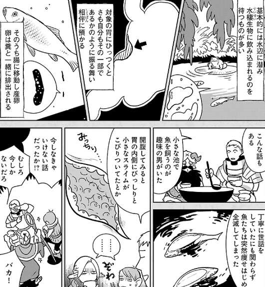 スライムのよもや話では、スライムの特性として基本的には水辺に潜み水棲生物に飲み込まれるのを待つものが多く、水棲生物の意に引っ付くとさも自分もその一部であるかのように振る舞い相伴にあずかります。さらにライオスは、小さな池で魚を飼うのが趣味の男の話を初めます。丁寧に世話していた魚たちが突然痩せはじめ全滅してしまい、何故かと思い開腹してみると胃の内側にびっしりと小さなスライムがこびりついていた、と仲間に得意げに話します。しかし、食事中にそんな話をされてマルシルとチルチャックは怒りますが、魔物に強い興味を持つライオスは何で怒っているのか、全く分かっていません。