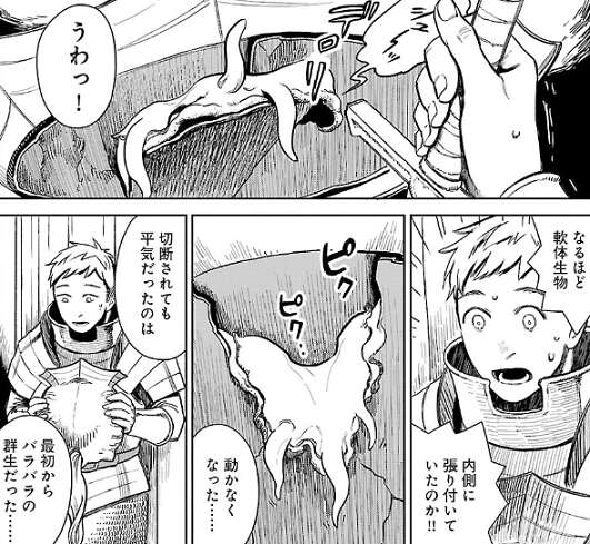 動く鎧は生き物であり、そして食えると確信したライオスは何処に内臓があり、どんな形をしているのか動く鎧を攻撃しながら、観察する事にします。卵のついた盾を狙ってスキを作り、頭の鎧を取りますがライオスの予想に反して頭の鎧の中身は空っぽで本当に何もありません。しかし、動く鎧は頭を取られた後だとライオスがどの柱に隠れているか見えておらず、やはり頭に何かあると考え断面の隙間を強引にこじ開けると中から軟体生物が出てきます。