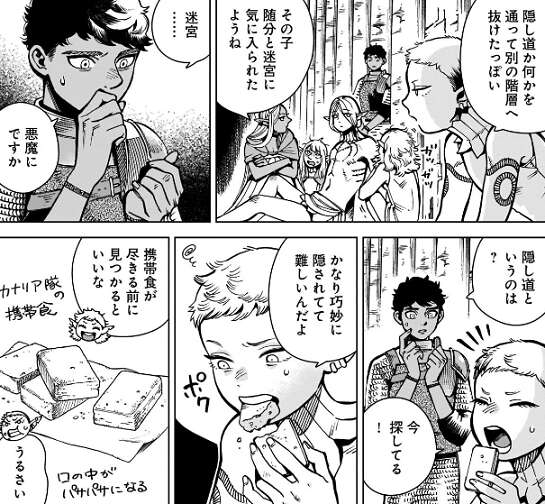 ライオス達はなんとか、迷宮の兎を食材として確保しますが、迷宮の入り口ではタンス達と上陸したエルフの軍隊とが言い争いをしていました。さらに第6階層のカブルーとカナリア隊は迷宮を偵察しますが、ライオス達を見つけられないでいました。ミスルンは近くに悪魔の気配を感じ、部下に命じて道を作らせてさらに迷宮の奥に進もうとします。しかしその様子を、狂乱の魔術師が操る魔物が監視していました。