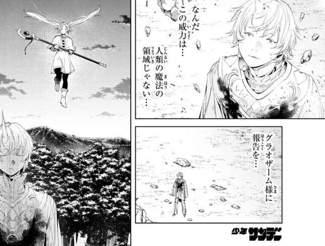 この時代の魔法は未来の魔法に比べて遅いようで、人を殺す魔法(ゾルトラーク)なら今ので勝負が決していた、とフリーレンは残念がります。一方、ツォルトはフリーレンが落下しながら正確な長距離射撃をしたことに、空中での訓練も無しにこんなことが可能なのか?と、驚きます。