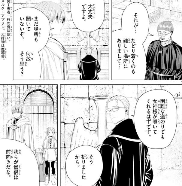 清貧のために極限の環境で自給自足することもあるそうですが、ハイターも断崖絶壁に建つ修道院を見て、まああそこまで極限なのはなかなかないとは思いますが…、とつぶやきます。ヒンメルがフリーレンに、魔法で飛んではいけないのか?と、聞きますが、この時代はまだ飛行魔法を人類は使えないので、人に見られるわけにはいけないと飛ぶことも出来ません。