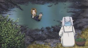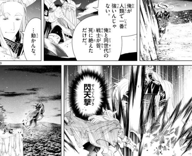 しかし、グラオザームの魔法はハイターが魔法で防ぎ、ヒンメルが剣でグラオザームの腕を斬り落とします。