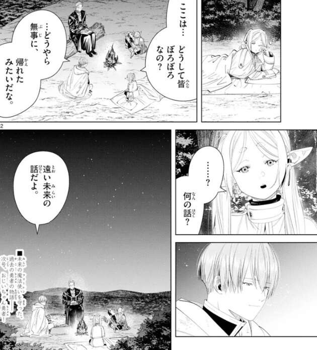 戦いが終わり、ヒンメル達とアイゼンは合流しています。フリーレンの意識は現代へと帰還したようで、過去の意識が戻ったフリーレンはどうして皆がぼろぼろなのか分からず、質問します。ヒンメルはフリーレンの様子を見て、どうやら無事に帰れたみたいだな、とつぶやきますが、何の話か分からず再びヒンメルに質問します。するとヒンメルは、遠い未来の話だよ、とフリーレンに答えます。