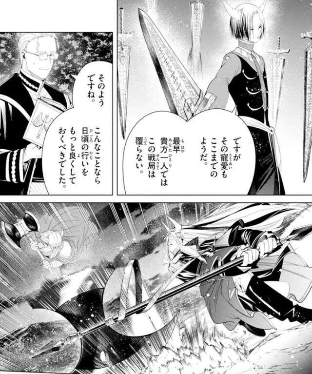 ソリテールの言葉を聞き、失せるようにヒンメルは言います。そして、アイゼンにも退却するように叫びます。一方、リヴァーレはアイゼンに、よもや敵に背を向けるとは言うまいな、と挑発します。