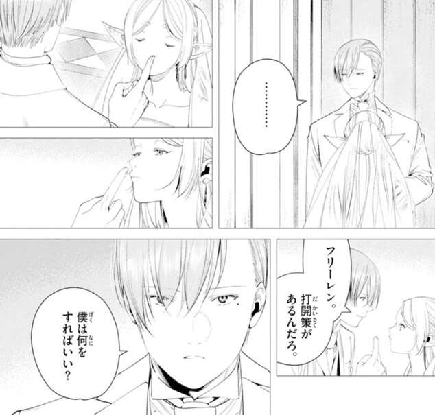 フリーレンは普段から魔力探知に頼り切っている弊害で、ヒンメルのように現実世界の事を感じることが出来ないようです。しかしそれは魔族も同じで、グラオザームにヒンメルを甘く見過ぎていた、とフリーレンはつぶやきます。グラオザームはヒンメルをもっと深い幻影の中へと連れて行こうとし、さらに魔法を使おうとします。