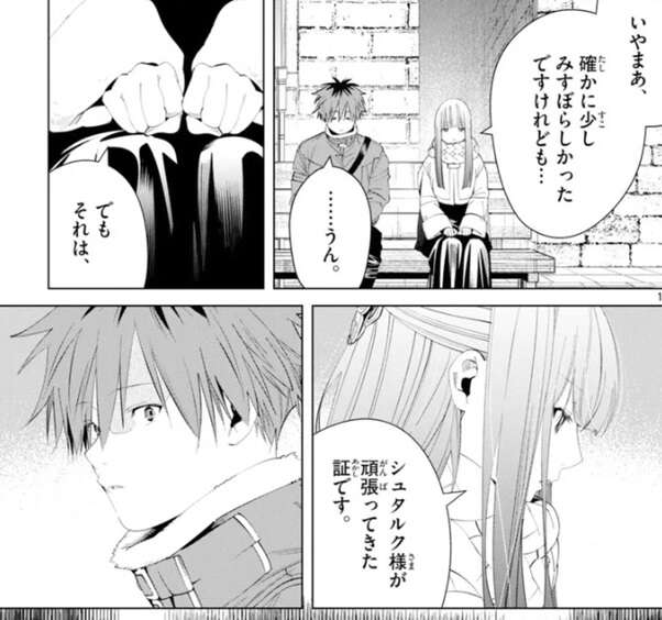フェルンは最初否定しますが、いやまあ、少しみすぼらしかったですけれども…、とフェルンは言い直した後、でもそれは、シュタルク様が頑張って来た証です、とシュタルクに言います。その言葉を聞き、シュタルクは師匠・アイゼンとの昔の会話を思い出します。
