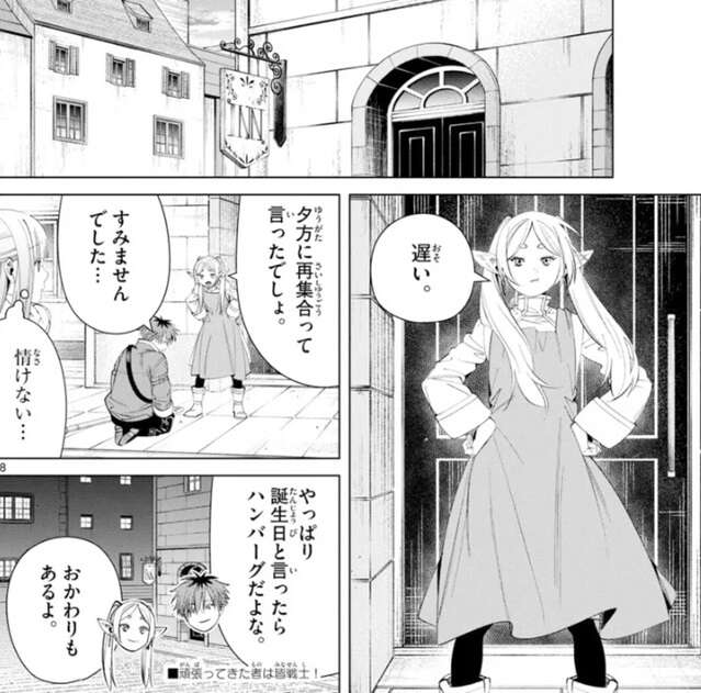 その後、フェルンとシュタルクは宿に戻りますが、ハンバーグを作って待っていたフリーレンから、遅い、と怒られます。夕方に再集合って言ったでしょ、とフリーレンに怒られ、シュタルクは正座をしながらフリーレンに謝ります。その様子を見てフェルンは、情けない…、と心の中でつぶやきます。その後、フリーレンが作ったハンバーグを食べたシュタルクは満足したようで、やっぱり誕生日と言ったらハンバーグだよな、とフリーレンに言い、フリーレンも、おかわりもあるよ、と答えます。