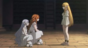 場面はフリーレン一行へと移り、フリーレン一行は泥濘(ぬかるみ)だらけの森を進んでいます。かなり険しい道で、フェルンが弱音を吐いていますが、帝都へ向かう道はここしか無いとフリーレンが言い、仕方なく歩いています。フリーレンは、私だって頑張って歩いているんだから文句言わないの、泣かない、と言ってフェルンを励ますと、シュタルクが、情けねぇな、この程度で、おぶってやろうか?と、冗談でフェルンに言います。
