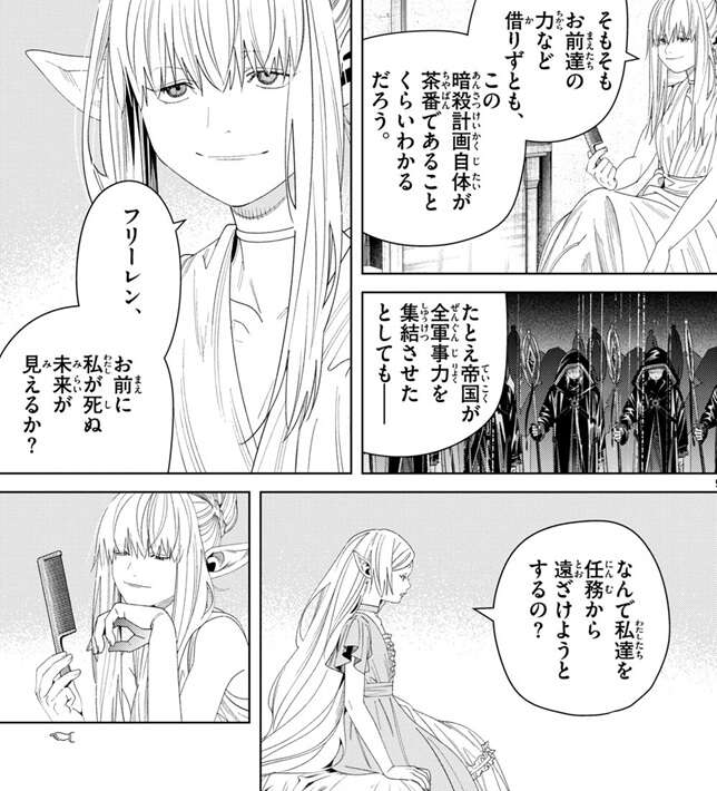 フェルンは一級魔法使いである前にフリーレンの弟子だからなとゼーリエは言い、そもそもこの暗殺計画自体が茶番で、たとえ帝国が全軍事力を集結させたとしても私が死ぬ未来が見えるか?と、ゼーリエは自分が暗殺されることはあり得ないと自信を見せます。しかし、なんで私達を任務から遠ざけようとするの?と、フリーレンは質問します。