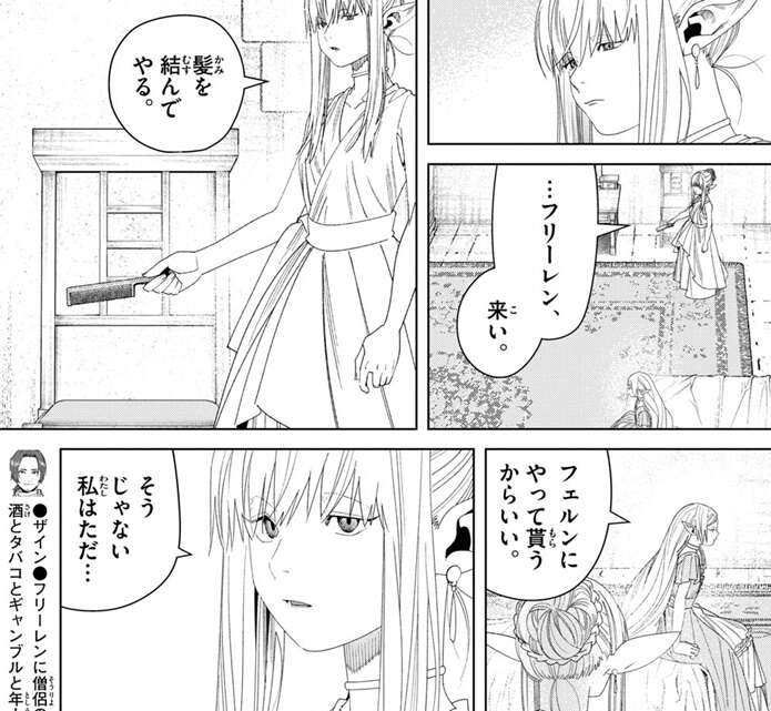 今度はゼンゼに座るように言い、ゼンゼの髪を結んでやろうとします。ゼンゼは髪くらい自分の魔法で出来ますと言いますが、いいから、おいで、とゼーリエは言いゼンゼを椅子に座らせます。ゼーリエが髪を結んでいる間、ゼンゼは今回の任務の選定基準を質問します。レルネンとか他にもっと適任がいたのではとゼンゼは言いますが、ゼーリエはあいつが舞踏会に来れる訳がないと言います。レルネンは50年以上前に宮殿から出禁を食らっていて、ゼンゼは、何やったんだあの人…、とつぶやきます。ただ、レルネンも動いていない訳ではないようで、ヴァイゼに移送されたグリュックやデンケンをレルネンが出迎えています。デンケンやレルネンも、今後何か動きがあるかもしれません。