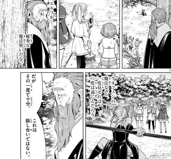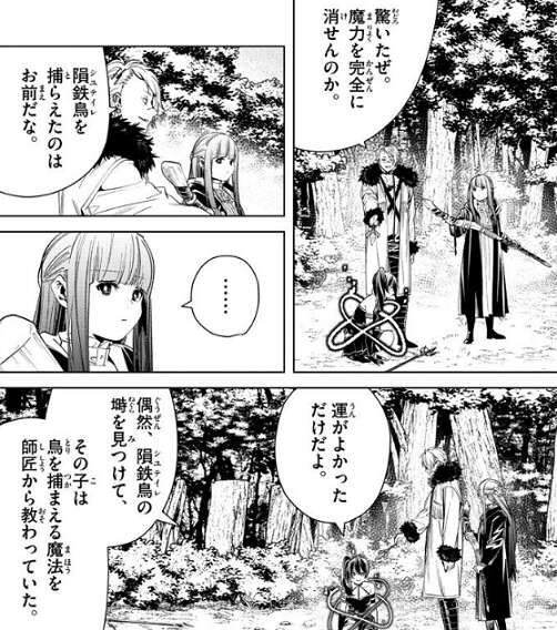 その言葉通り、ラオフェンはまた突然消えてしまい、気付いた時にはフリーレンが持っていた隕鉄鳥が入った籠が無くなっています。隕鉄鳥を奪われてしまいますが、ふーん、面白い魔法だ、とフリーレンは慌てることなくつぶやきます。