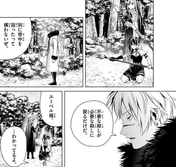 ユーベルはヴィアベルの背後を攻撃するような素振り見せますが、ヴィアベルが、不要な殺しが必要な殺しに戻るだけだ、と言うと攻撃を止めます。