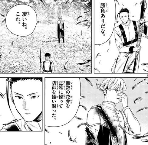 一方ラントとシャルフの戦いは、シャルフの花弁を鋼鉄に変える魔法(ジュベラード)によってラントは重傷を負ってしまいます。重傷を負っても冷静にシャルフの魔法を分析するラントに、降伏しないなら次は首を斬り落とす、とシャルフは言います。
