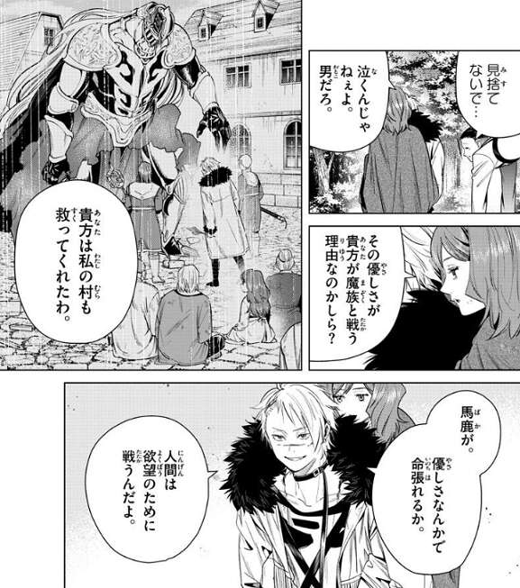 ヴィアベルはエールをおんぶし、シャルフを魔法で運びながら移動します。ヴィアベルは二人に、戦闘不能2名で隕鉄鳥を奪えないこの状況じゃあ、俺達の不合格は確定だなと話します。エールは、不合格なのに私達を助けてくれんだ、優しいのね、とヴィアベルに言い、その優しさがあなたが魔族と戦う理由なのかしら、あなたは私の村も救ってくれたわ、とヴィアベルに話しかけます。しかしヴィアベルは、優しさなんかで命張れるか、人間は欲望のために戦うんだよ、と言います。